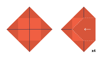 Tout en ouvrant les volets supérieur et inférieur ramener les deux volets latéraux vers le centre. Ensuite, repliez chaque pièce vers le centre de façon à ce que les lignes droites verticales des bords rejoignent celles du centre.