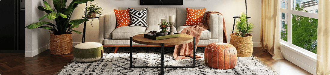 Faites attention à laisser suffisamment de place autour. La dimension standard qui permet un espace de circulation confortable nécessite 30 à 45 cm entre le canapé et la table. En même temps, si vous avez un meuble TV à l'opposé de la table basse, il faut considérer une distance de 60 à 76 cm entre les deux. Ce placement crée suffisamment d'espace pour une bonne circulation et définit le salon comme étant aéré mais aussi compact.