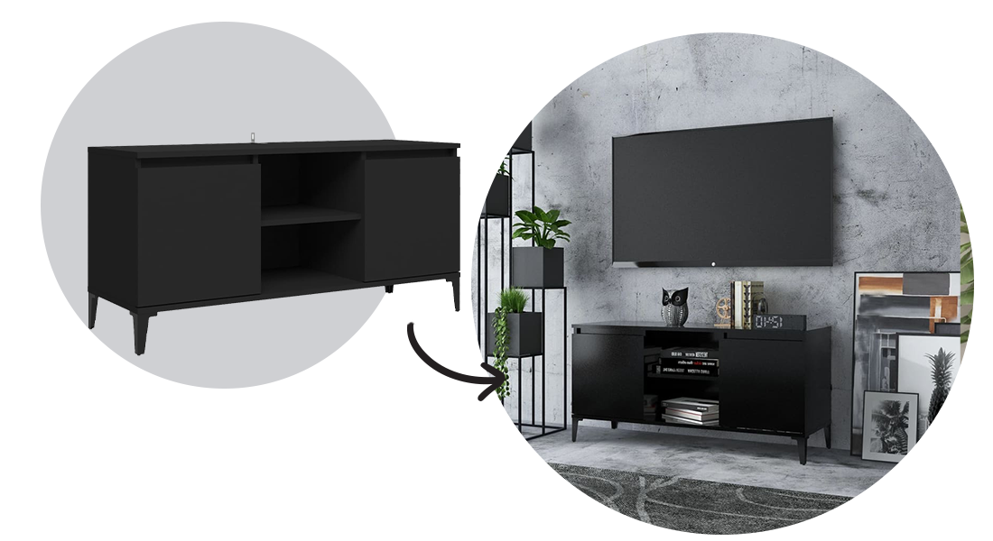 Pour créer une véritable ambiance industrielle, utilisez des meubles qui combinent les deux matières industrielles les plus populaires, le bois et le métal. Choisissez des meubles qui peuvent facilement devenir la pièce maîtresse de la pièce, comme un meuble TV en bois noir avec pieds en métal et étagères ouvertes.
